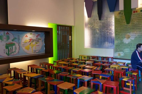 這區有很多彩色的小椅子讓人休息