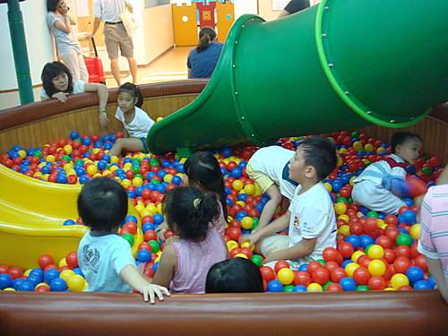 但沒多久後比比就會在球池裡一直玩...也會丟球給小朋友