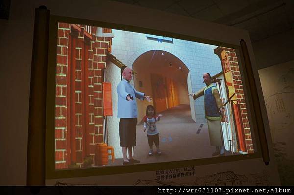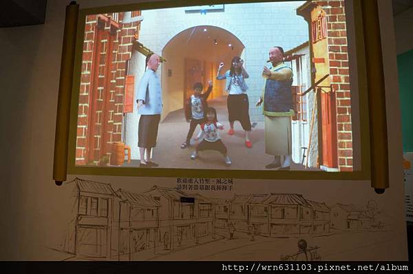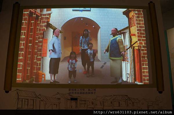 牆上播放著客家文化的影片