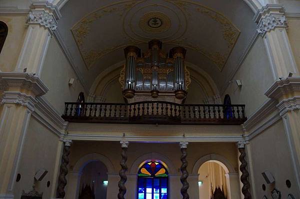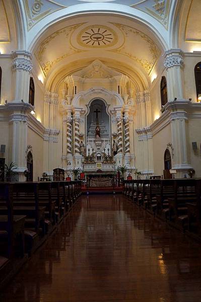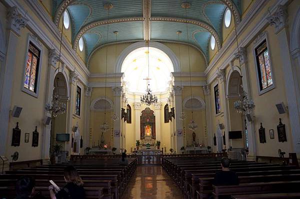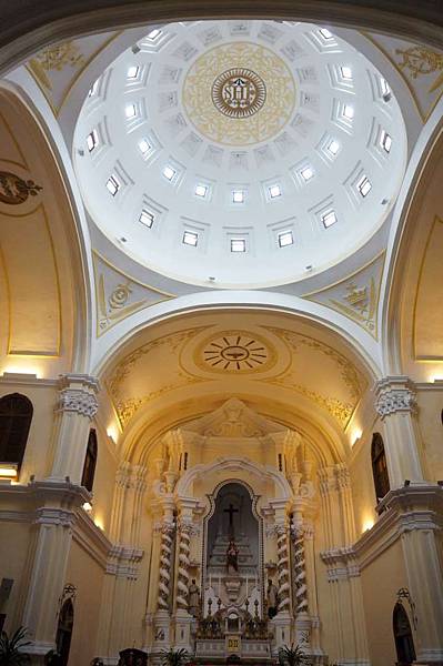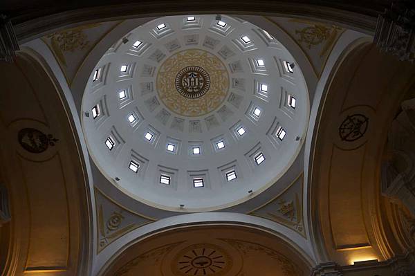 中間是黃色的IHS耶穌會會徽。這天花板的設計讓整個教堂灑滿均勻且明亮的光線。
