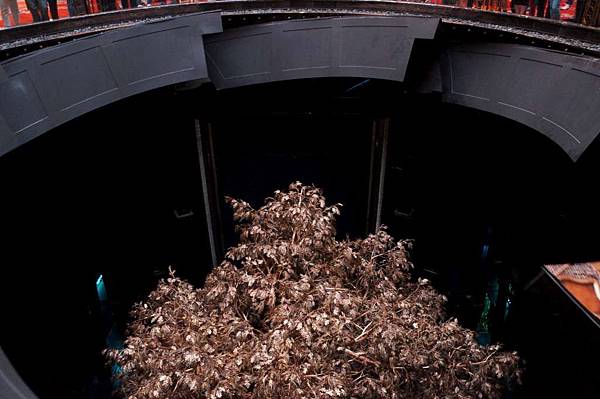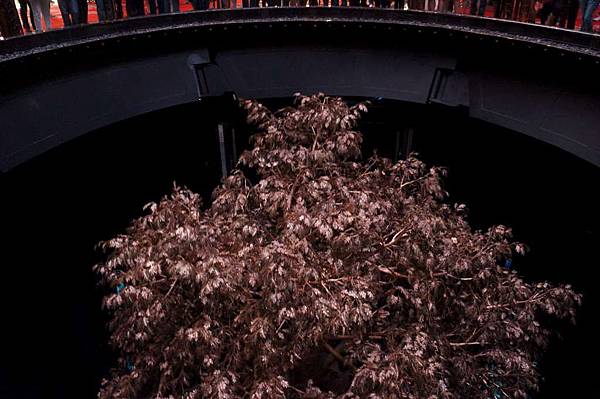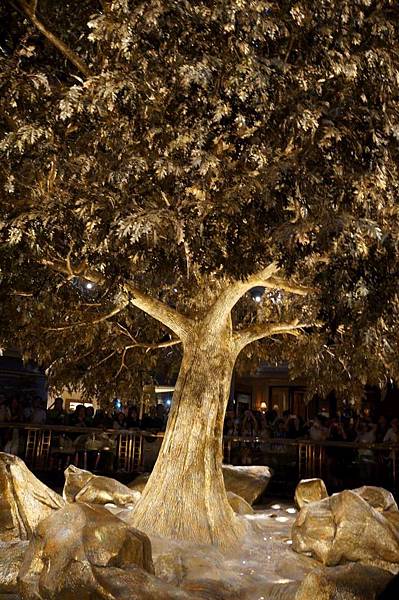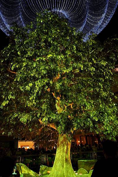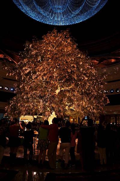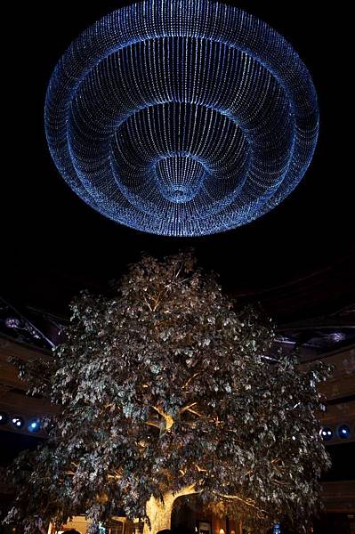 燈幕頻往兩邊推開,一座大型的水晶燈往下,接著一棵五彩十色的「吉祥樹」徐徐由地底升起