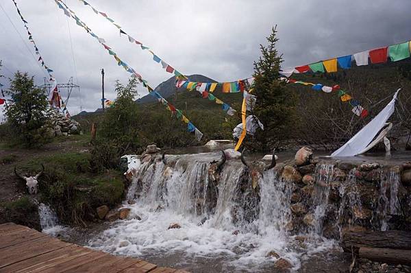 藏族聚落一定具備著三大特徵:五色旗、白塔和有上面放著犛牛頭骨的石堆。