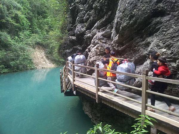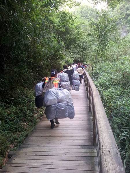 景區清潔人員辛苦挑著垃圾。