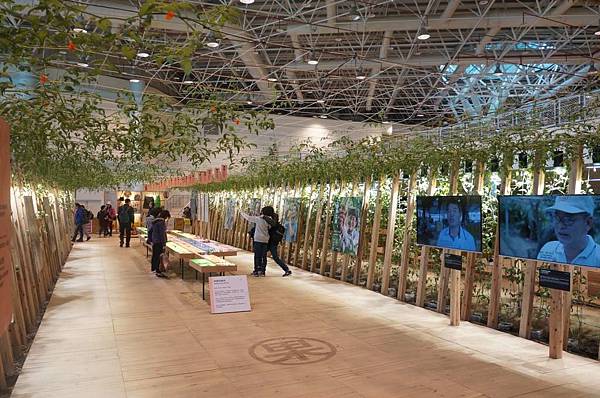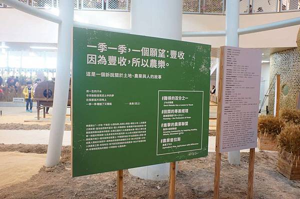 臺中花博外埔園區樂農館以「一方地,千畝田,以農為樂」為策展理念,在開闊的地景式展間,以農業、生活和人文為核心,談論土地、作物以及農人的故事。稻米、水果、蕈菇、茶葉四種在台灣的重要作物成為主展區展示背景,在其上探討台灣農業由生產、生活及至國際化的發展進程,發掘農人們「以農為樂」的驕傲。