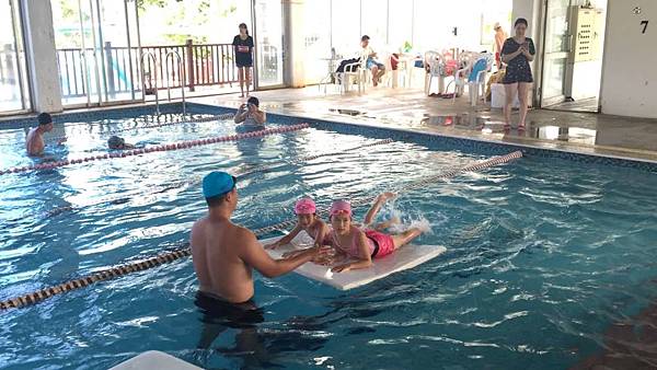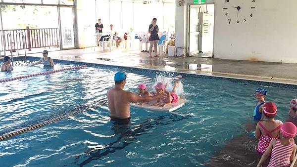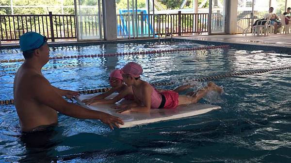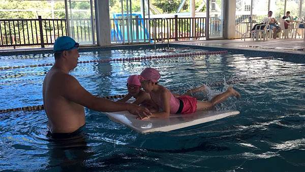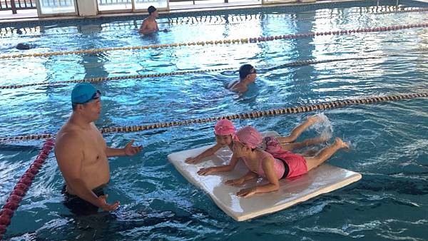 教練讓大家趴在板子上練踢水
