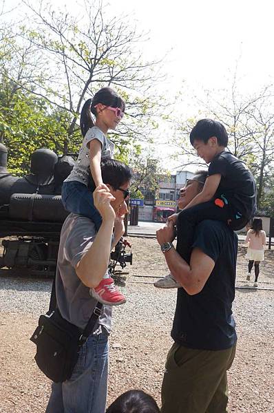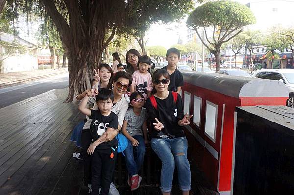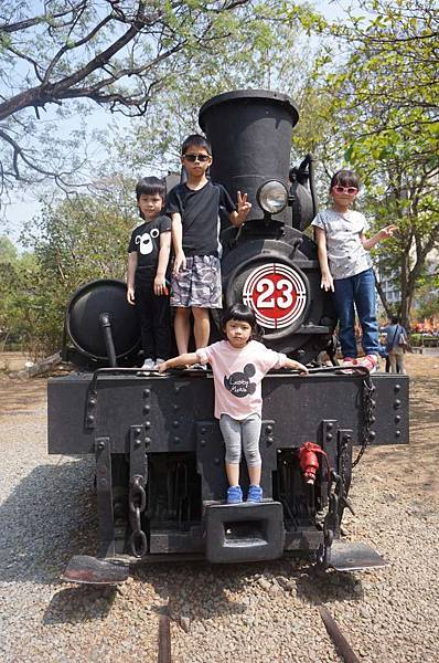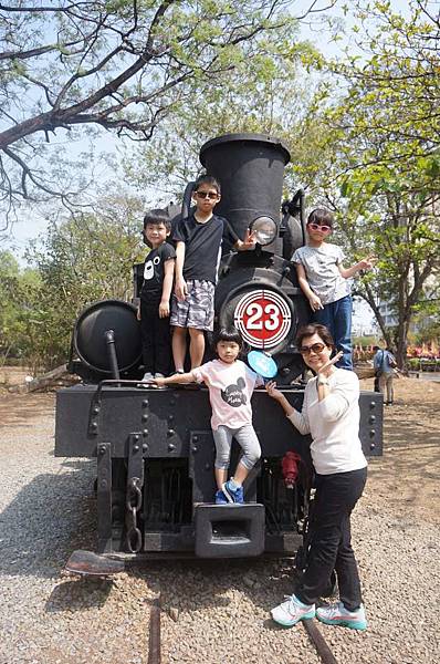 小朋友一起在火車頭上拍照