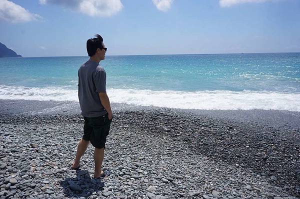 比爸脫掉鞋子馬上跳進海水裡踩踏一下