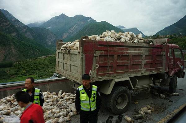 路上遇到車禍,東西(好像是農作物)倒了一整地。