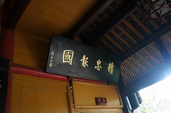 「精忠報國」牌匾,蔣中正民國24年題字,這塊匾能留存下來,是因為文化大革命時,有人將之塗上泥灰,寫上毛主席萬歲,才躲過紅衛兵的毒手。