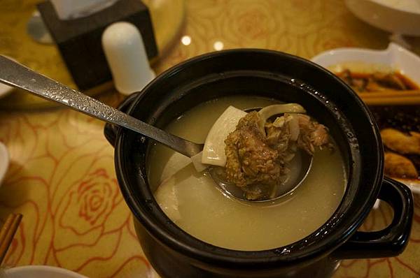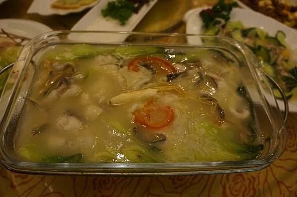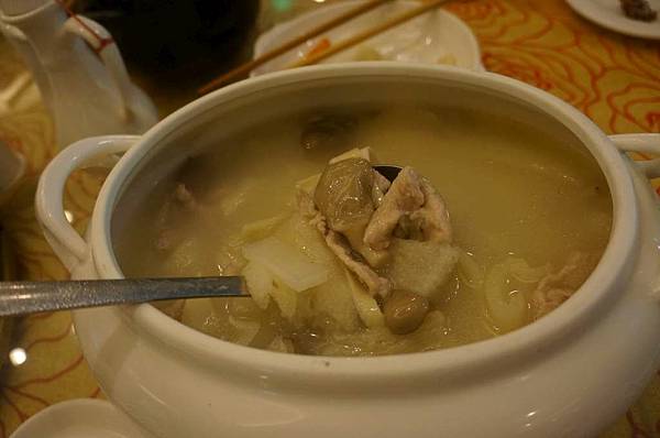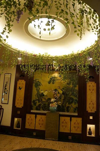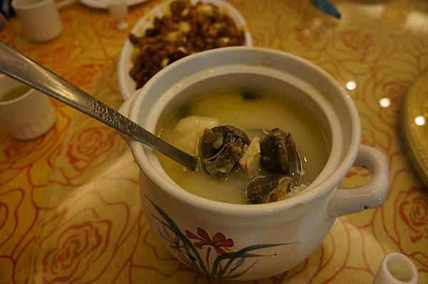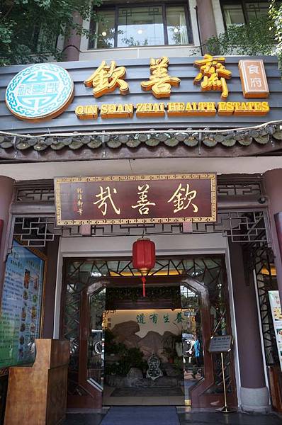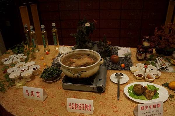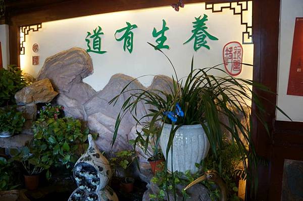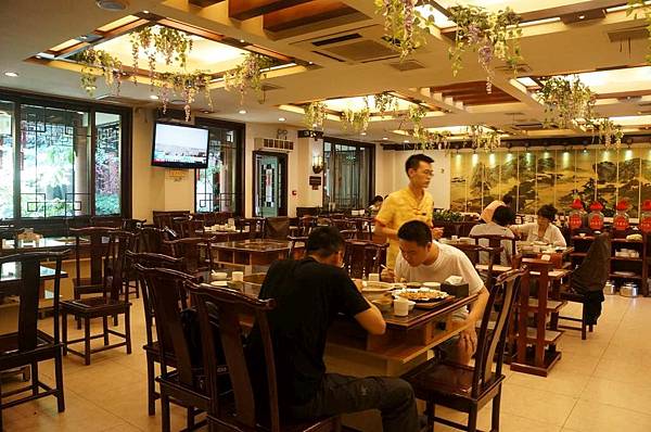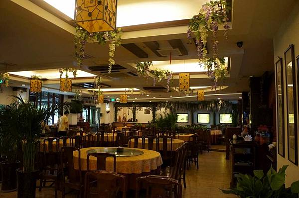 餐廳內部,擺設相當雅致,右邊遠處紅色一壇壇的養生酒。