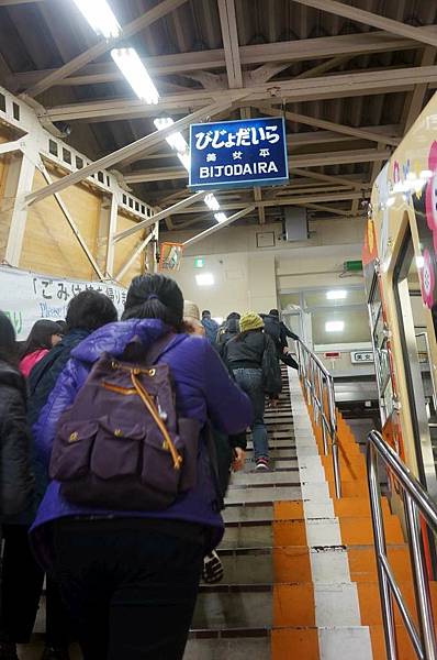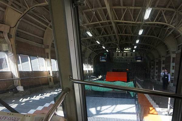 纜車要進站了,遊客站在白線後面,避免太靠近纜車。右上方突起的地方應該是臨時停車處。