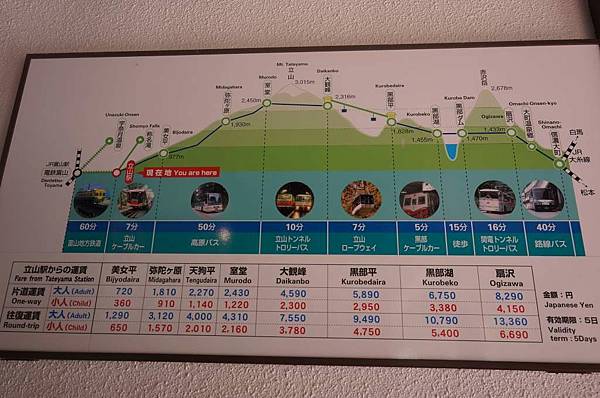 今天行程會搭乘6種交通工具,也就是除了最左邊及最右邊外,中間這6種,海拔會從立山車站475公尺上升到室堂2450公尺,比阿里山還高。