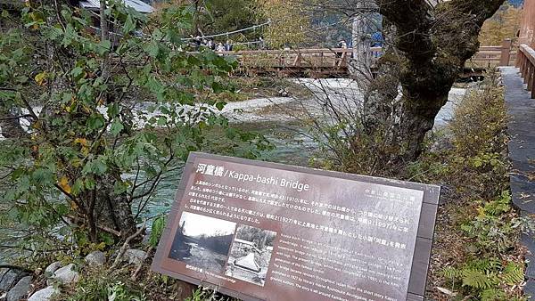 河童橋採用木結構建造而成,並已成為上高地特有的地標。日本小說家芥川龍之介也由此獲得靈感,於1927年創作了小說《河童》,在小說裡,講述故事的主人公只為了進入神秘的河童之地而前往上高地(河童是日本民間傳說中的一種水怪)。