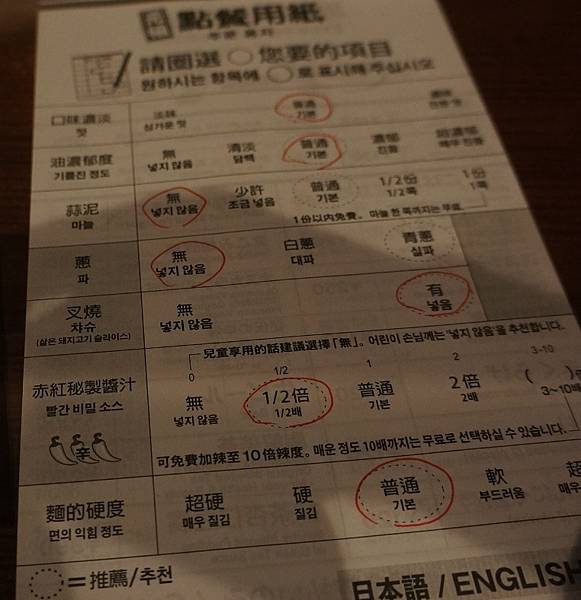 點餐用紙,這張是中文及韓文共用,可以選擇口味濃淡、油濃郁度、蒜泥、蔥、叉燒、赤紅密製醬汁、麵的硬度等。