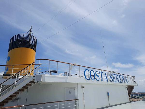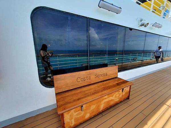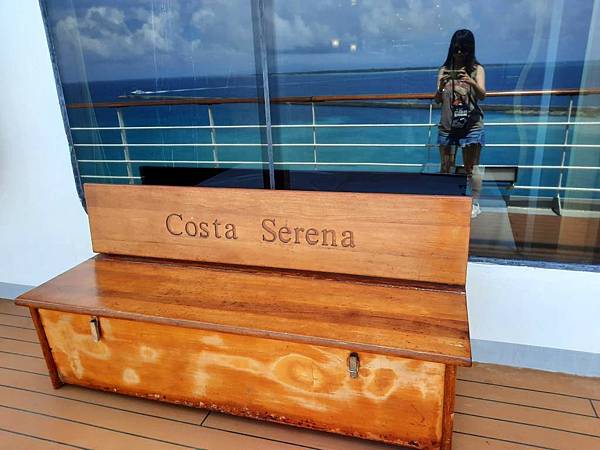我在拍這個印有「Costa Serena」木製椅子,不小心拍到小鮮肉,呵呵。