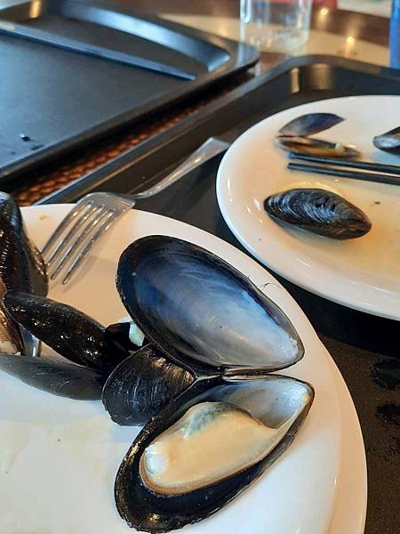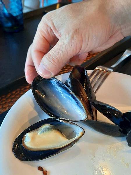 哇賽!今天的午餐有淡菜耶,先拿幾顆試試看。