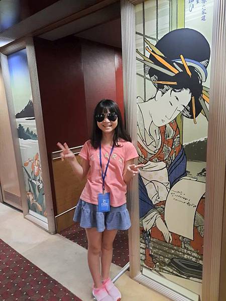 吃完午餐,我們先回房間,咪咕跟走道間日式圖案合影。