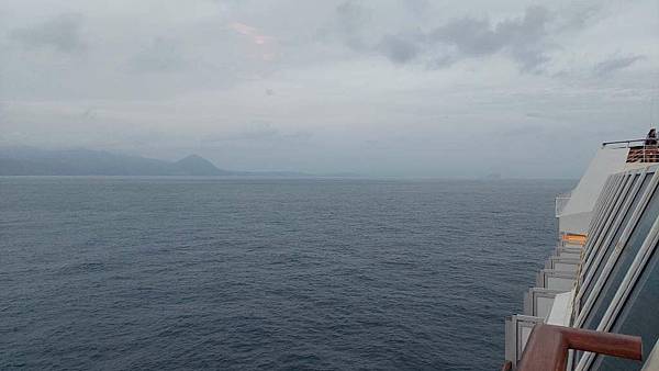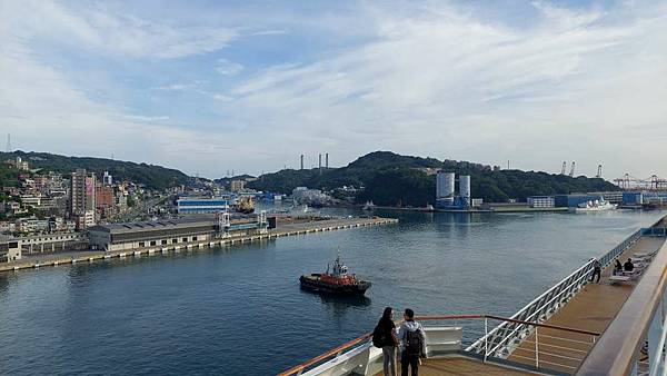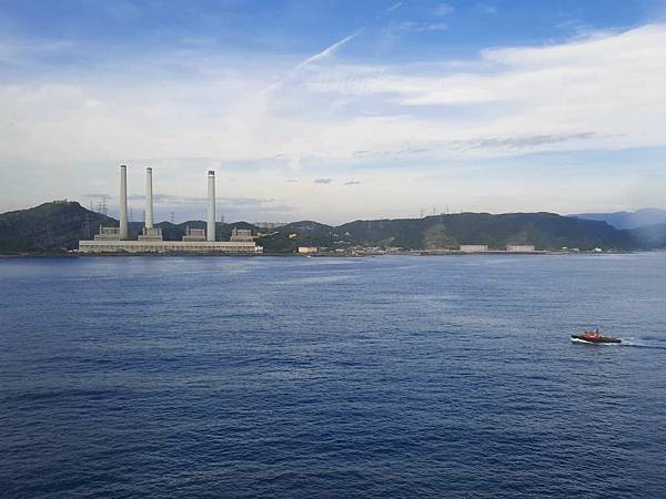 在吃早餐的時候,郵輪繞過基隆嶼,協和電廠的3根煙囪離我們很近了,旁邊的小船準備引領入港了。