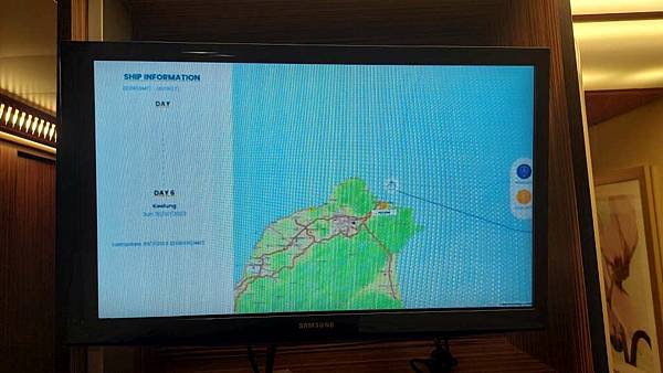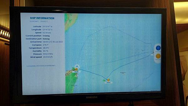這是我們這趟航程路線,中間那條直線是原本從基隆到那霸的路線,但我們因為颱風提早出發,所以路線就變成上方的弧線。