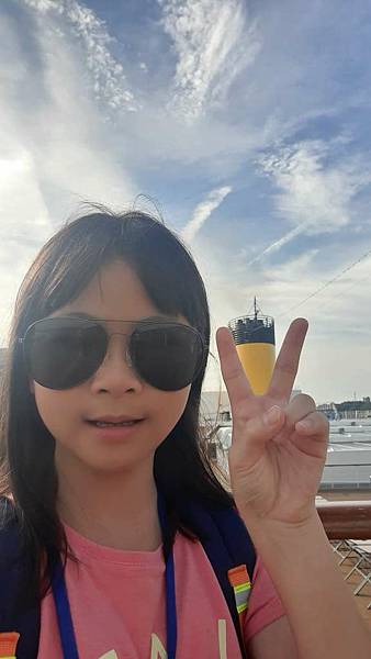 郵輪煙囪恰巧在咪咕的手指間。