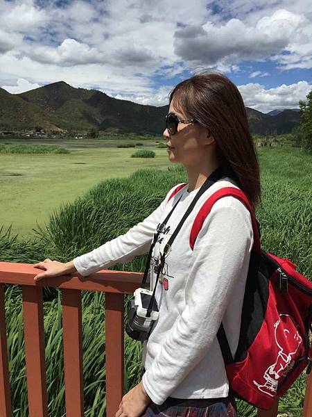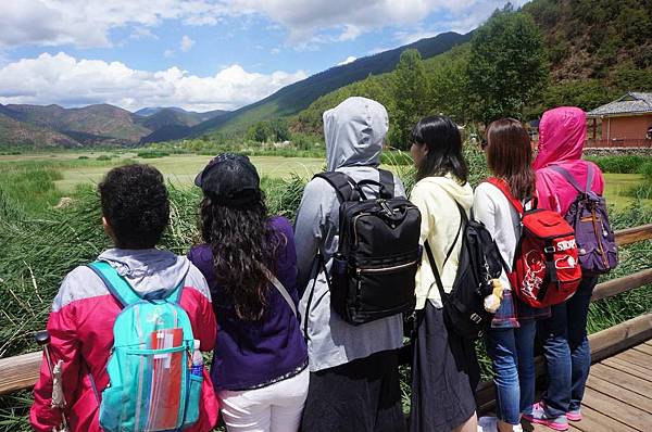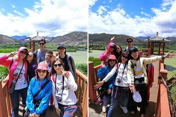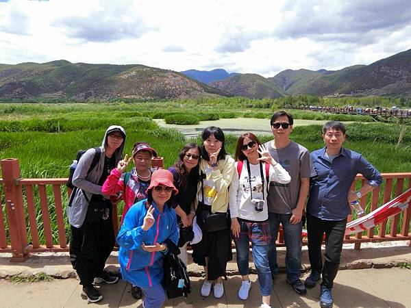 一群遊客排排站,正在拍攝瀘沽湖美景。