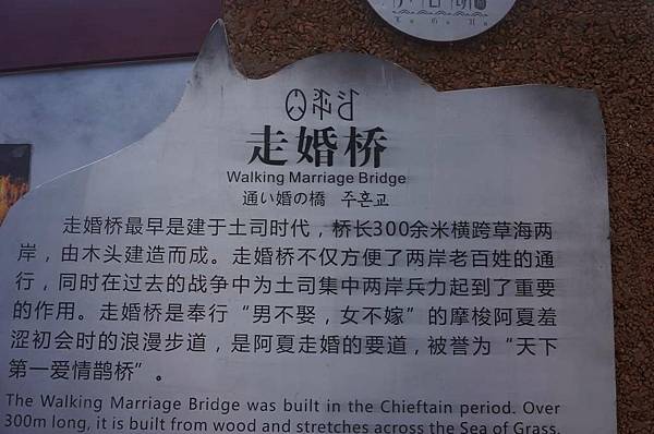 走婚橋位於瀘沽湖東南水域的草海區域,是瀘沽湖上唯一的座橋,連接兩座村莊,為情竇初開的摩梭族男女開啟一段浪漫的約會。橋下由於長年泥沙淤積,導致水深變淺,長有茂密的蘆葦,遠遠望去,像一片草的海洋,故當地人稱其為草海。