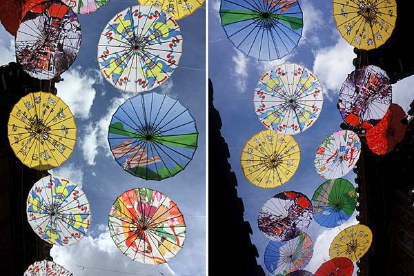 各式各樣的彩繪傘倒掛在空中,蠻別緻地。