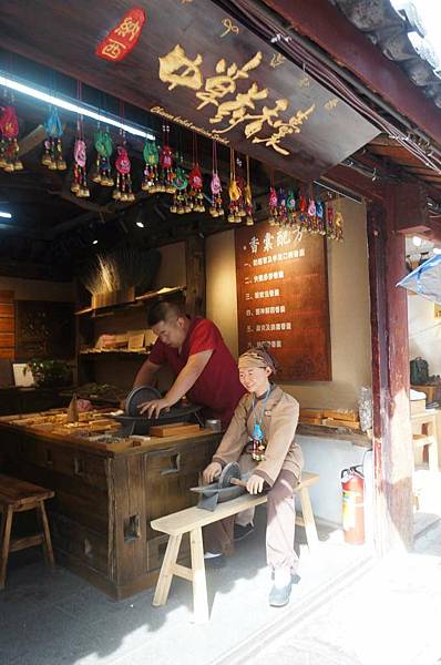 中藥行板凳上假人偶在研磨藥材,與後面的真人磨藥相映成趣。