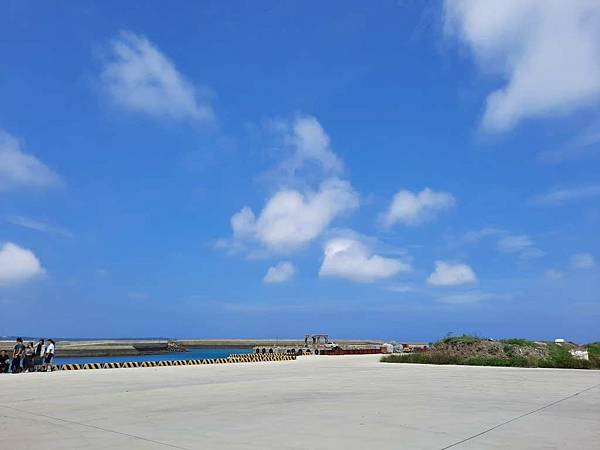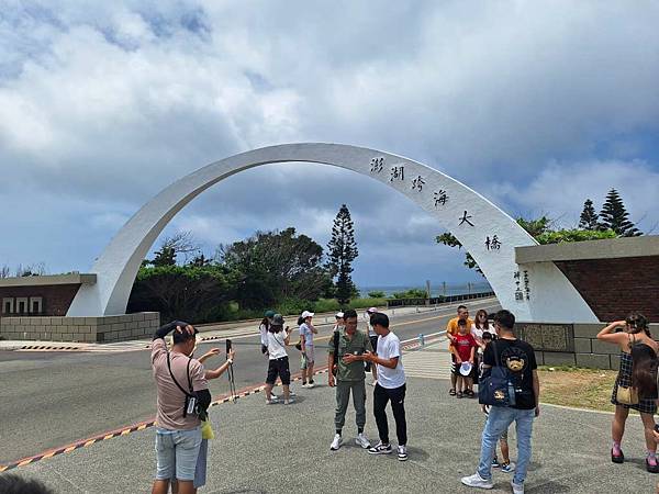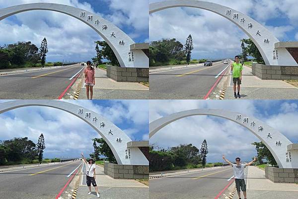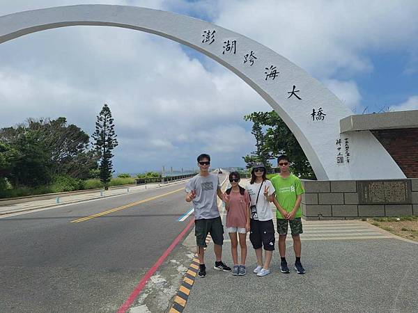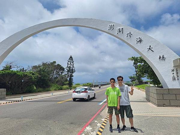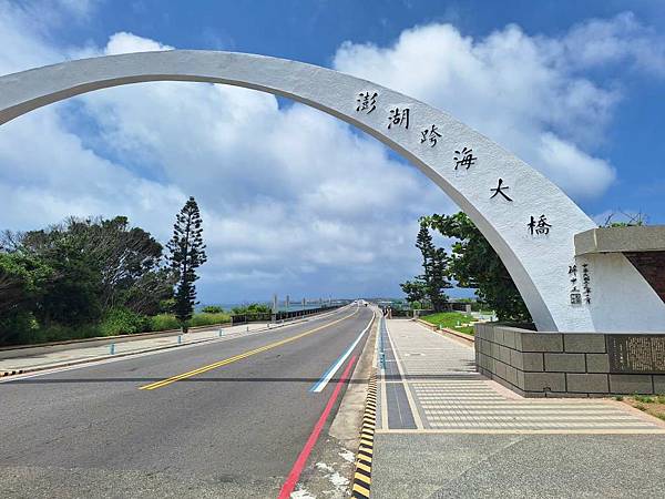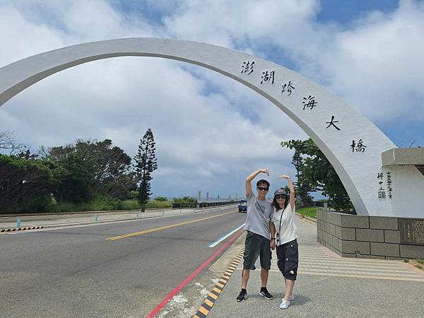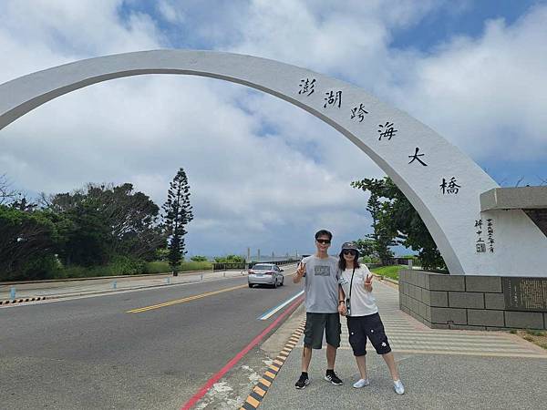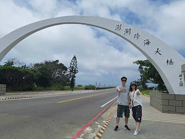吃吃喝喝結束後,我們驅車至附近的跨海大橋,開車只要2分鐘,從停車場到跨海大橋走到也要2分鐘。此時天空晴朗,不像早上剛到澎湖及後寮天堂路時陰陰。太陽超大,我們趕緊在停車場塗防曬乳,保護做好了再走去跨海大橋。