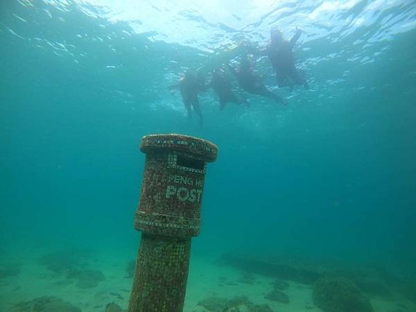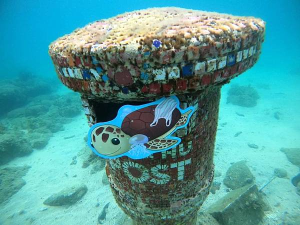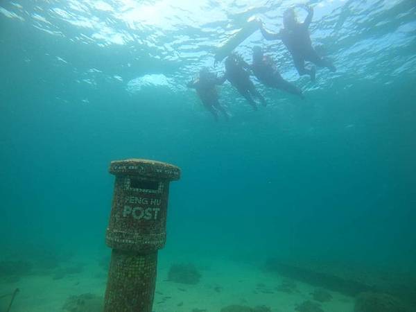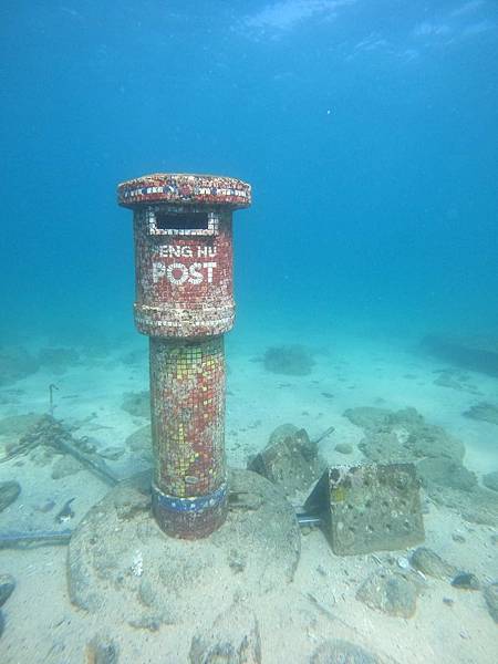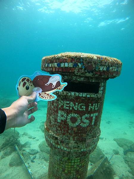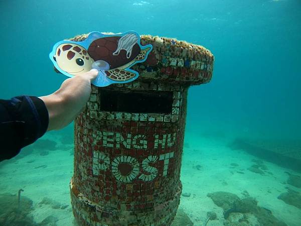 教練潛入海底幫我們寄信。當然,沒有真的放入郵筒,因為老闆說如果放入郵筒容易隨著海流漂出來,來郵筒收信的人要一段時間才會來,明信片不見的機率非常高,所以擺個樣子拍照一下,事後拿回樂福海洋工坊,他們再幫忙寄出。
