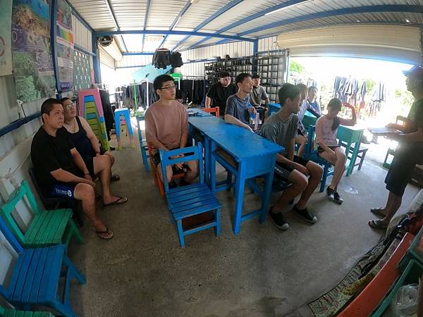 著裝完畢,教練先幫我們在店門招牌前拍照。這邊也有提供有度數的蛙鏡,我們以為沒有,所以比爸在飯店時就先戴上拋棄式隱形眼鏡,比爸從高中時就開始戴隱形眼鏡,在6、7年前開始,不管是長戴型還是拋棄式,眼睛都戴不太住,會乾癢,之後就變成戴眼鏡,而今天因為水上活動戴上拋棄式隱形眼鏡,據他說,還可以,一直撐到浮潛結束才拔掉。