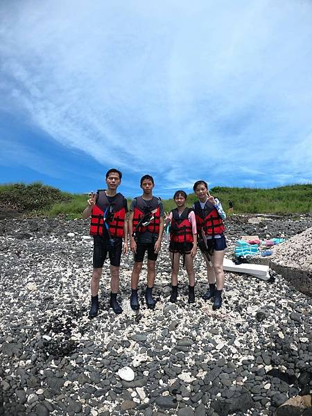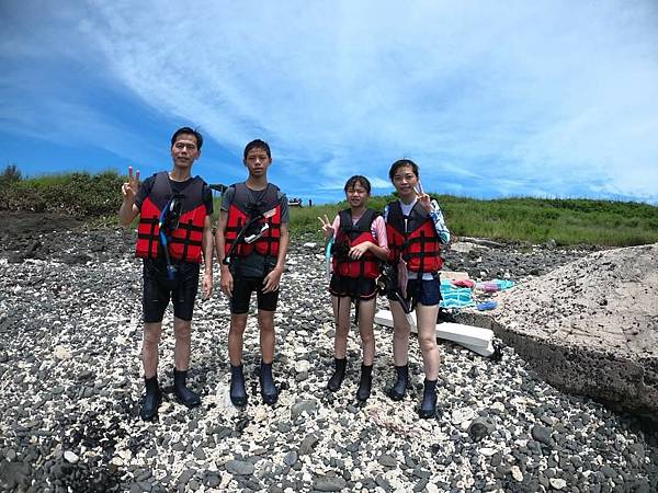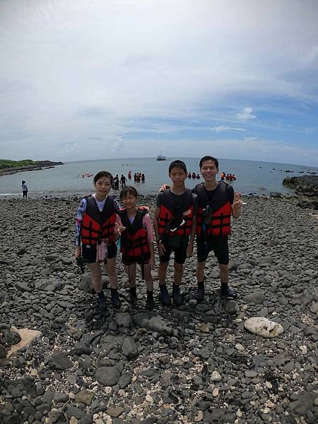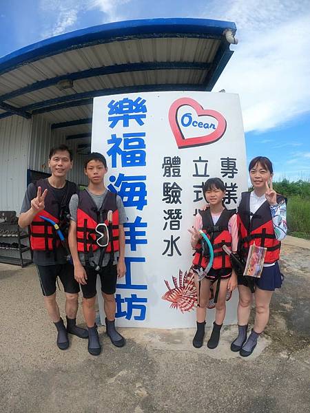 上岸後,教練幫我們全家拍照,海底郵筒浮潛成功。