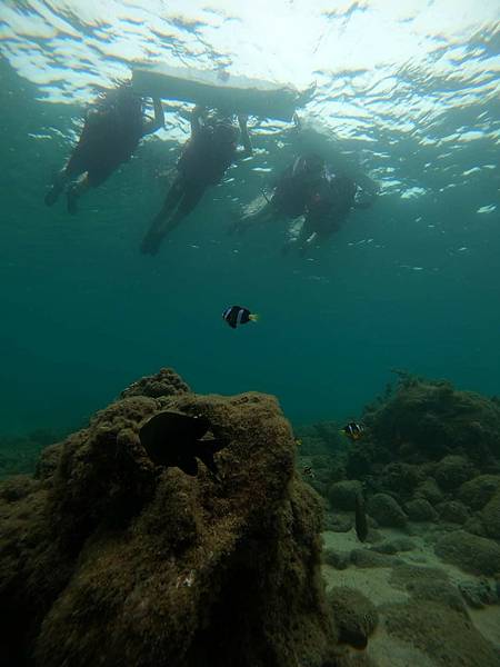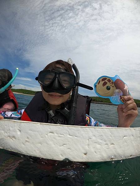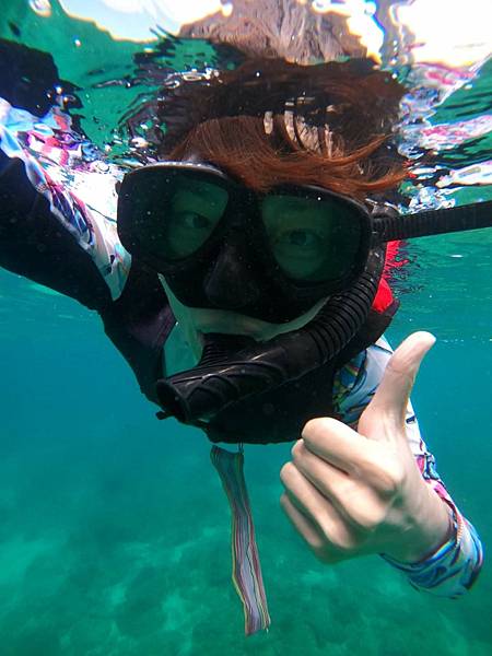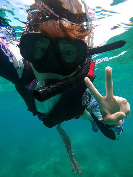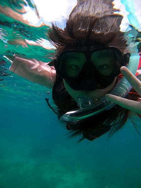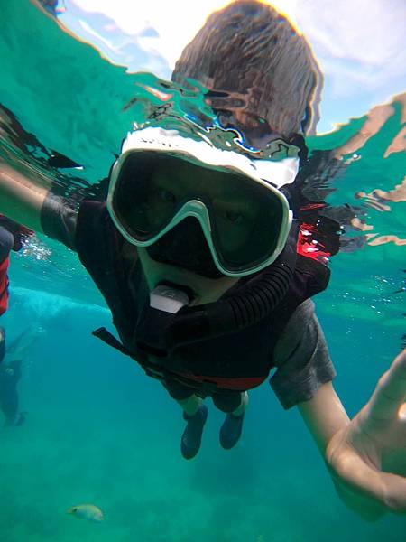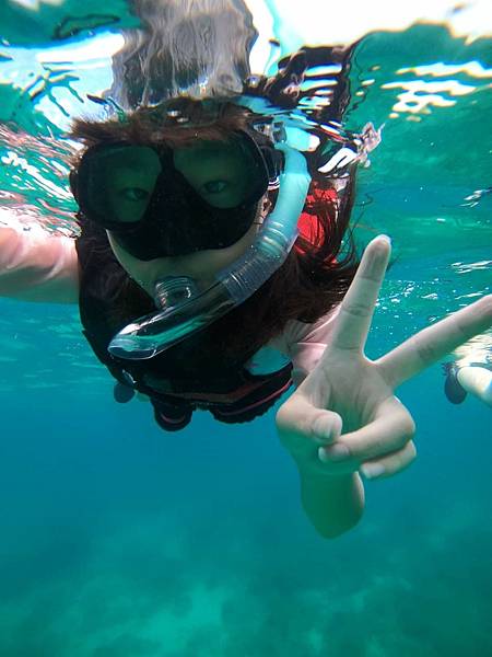 郵筒這邊海水比較冷,且我們浮潛了一段時間,大家都有點冷,尤其是手,教練幫我們跟海賊船拍最後一張照後,就把我們拉回岸邊。