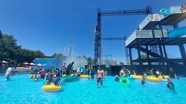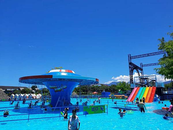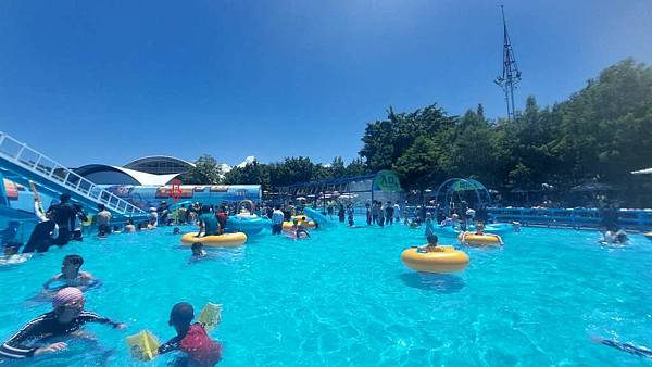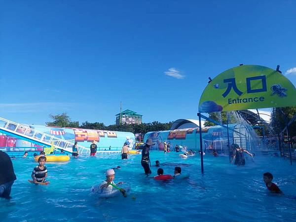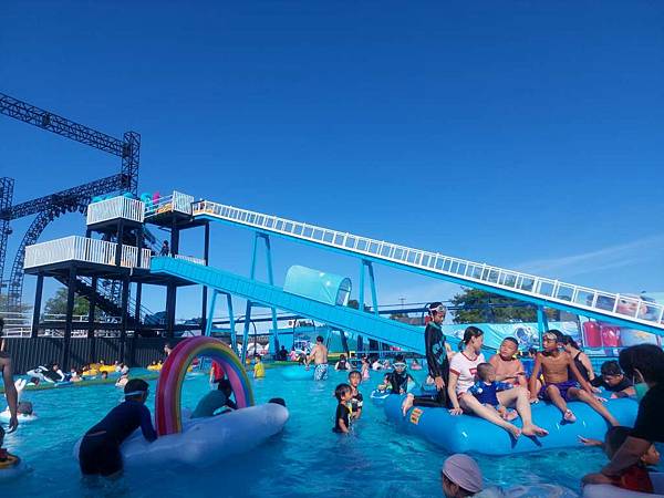 太空中繼站的水域有飛碟氣墊讓小朋友玩,也有很多人排隊拿了泳圈後在水中玩,而不去玩漂漂河或水晶滑道。