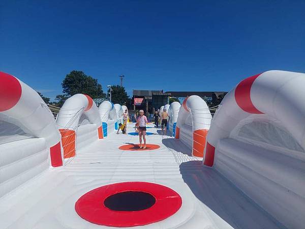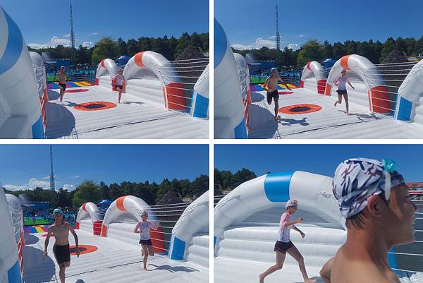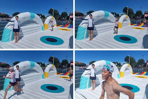 接下來,我們來玩氣墊橋。剛踩上去時,覺得有點燙,後來才比較適應。