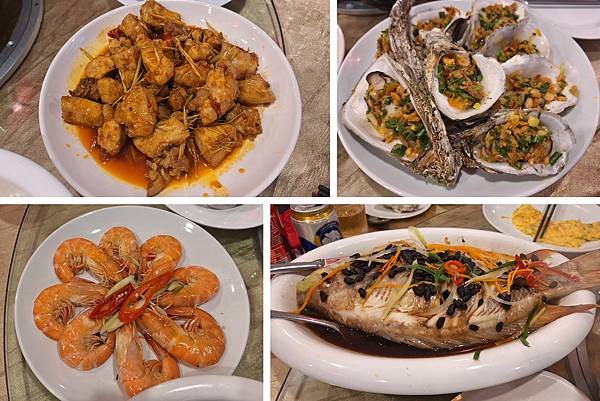 晚餐的菜色,相當豐富,這邊靠海,海鮮種類很多,我們這團18人,分成1桌10人(公司同事員工旅遊)及1桌8人(4人+2人+2人),所以蝦子及烤蚵都按照人數上菜。