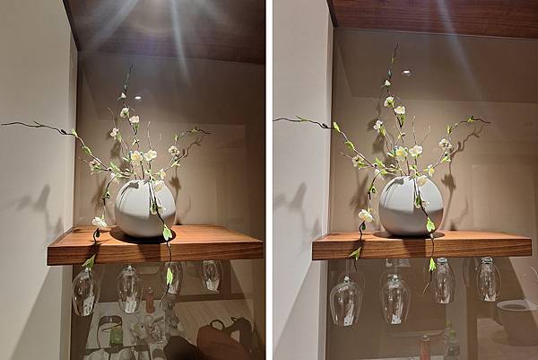 回到房間,拍攝美麗的盆景,一開始下面有些雜物(左),於是再重拍,結果現在仔細看,竟然馬桶入鏡了,呵呵。