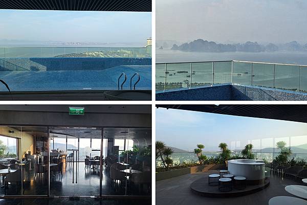 今天早上起床吃早餐前,我們又到了25樓。早上下龍灣比昨天晚清晰(右上);酒吧大門深鎖(左下),這麼早當然還沒開;露天休憩區白天模樣(右下)。