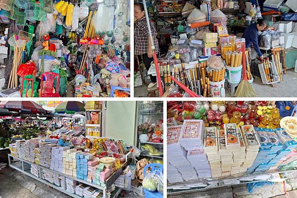 走到外圍,有許多五金雜貨店,右上角下方一根根長長的管子,是用來抽水煙的。也有賣冥紙的店,可以燒美金給祖先。