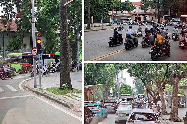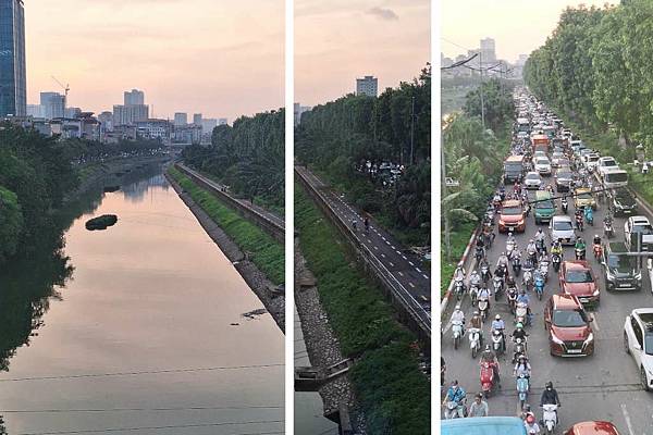 寧靜的河道(左)、悠閒的單車道(中)、擁擠的車道(右)。