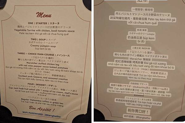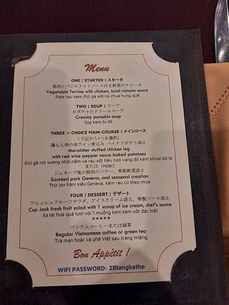 菜單,有英文、日文、越文,就是沒有中文,可能台灣或中國很少團會來吃,現場則有2桌日本人。