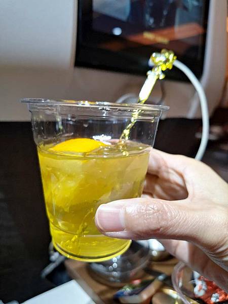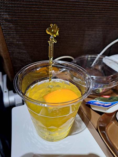 澄黃色的特調飲料,有別於去程的湛藍色。