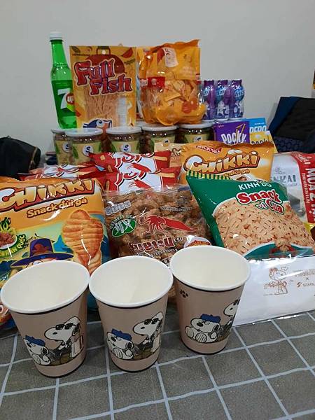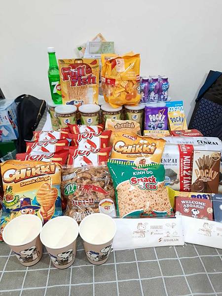 我們腿上滿滿一袋在樂天百貨超市購買的零食,到了機場打包進行李箱。