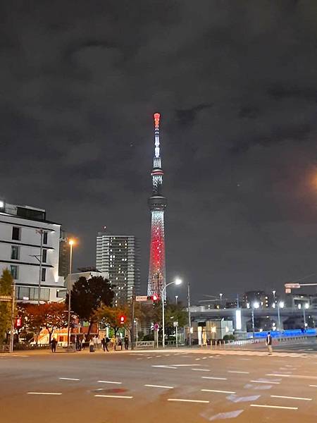 從地鐵淺草站出來,往右邊看高聳的晴空塔就在眼前,今天是紅色的。