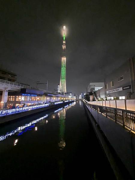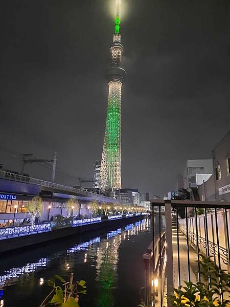 晴空塔倒映在河面上。