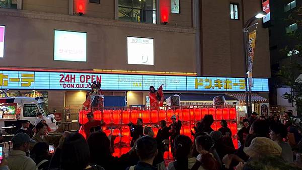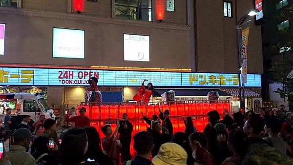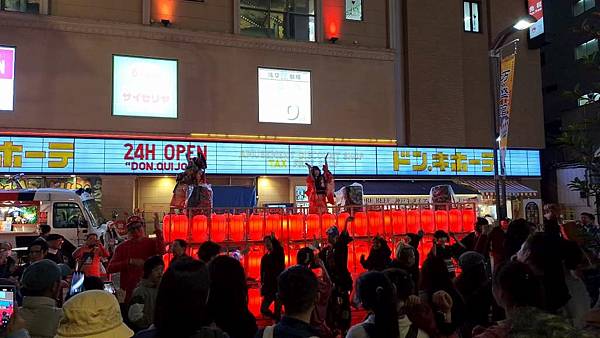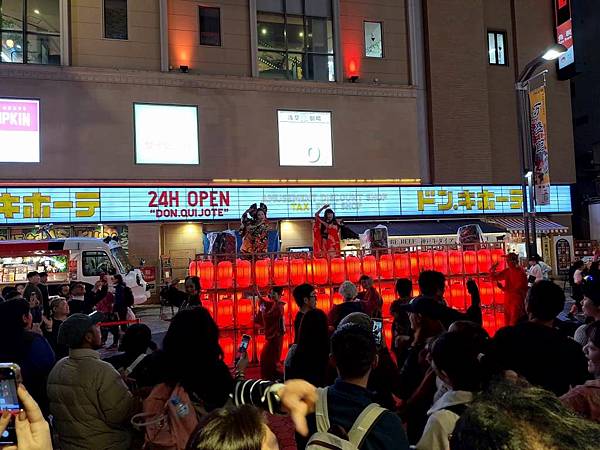 趕在UNIQLO晚上8點結束營業前採買完畢後,走出UNIQLO大門,門口正好有藝妓歌舞表演,大家跟著跳起舞來,氣氛很嗨。