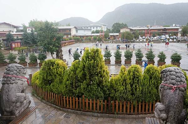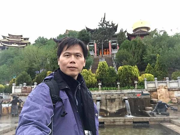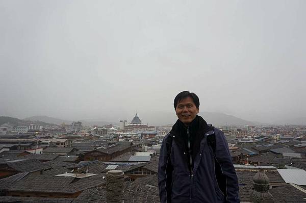 我們蹲下來拍照,想將古城入鏡,結果某人站著直挺挺,把古城風景全遮住了。