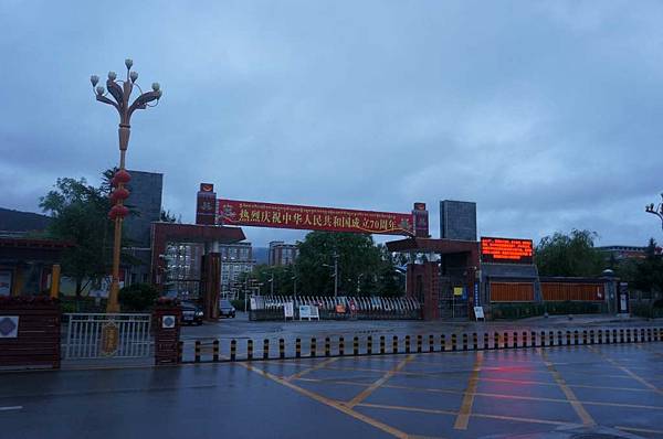 這是學校,門口掛著慶祝中華人民共和國成立70周年的紅布條。
