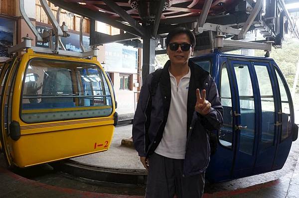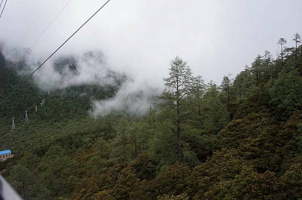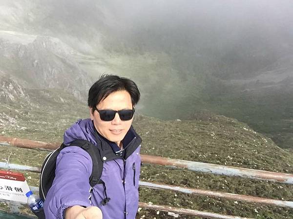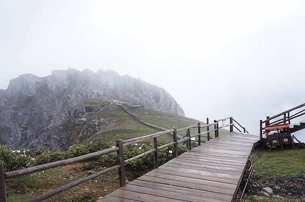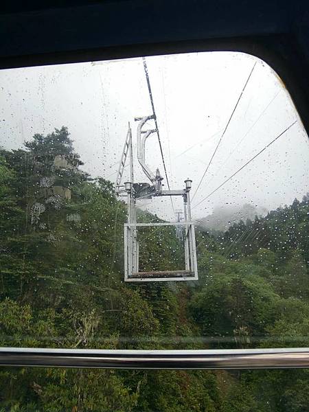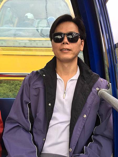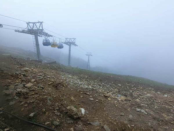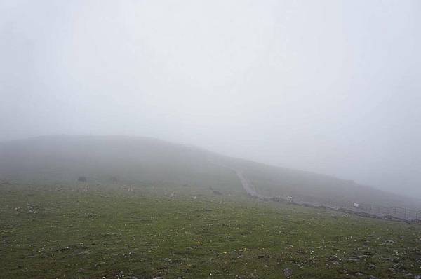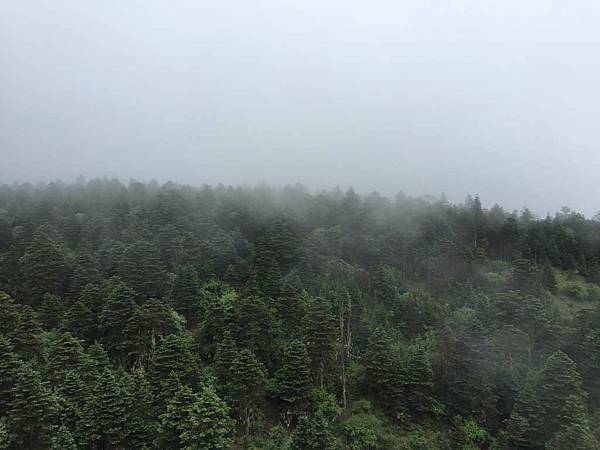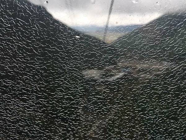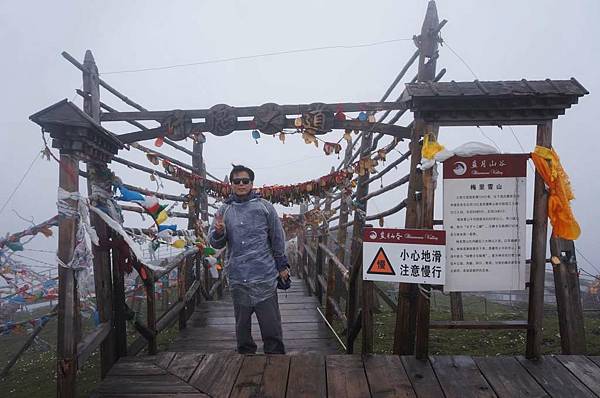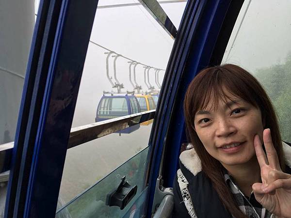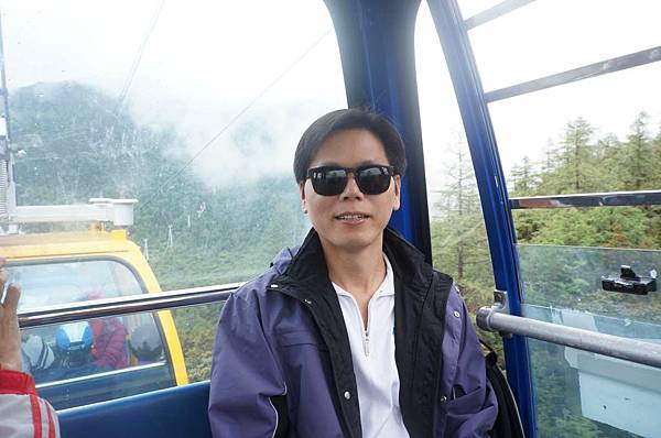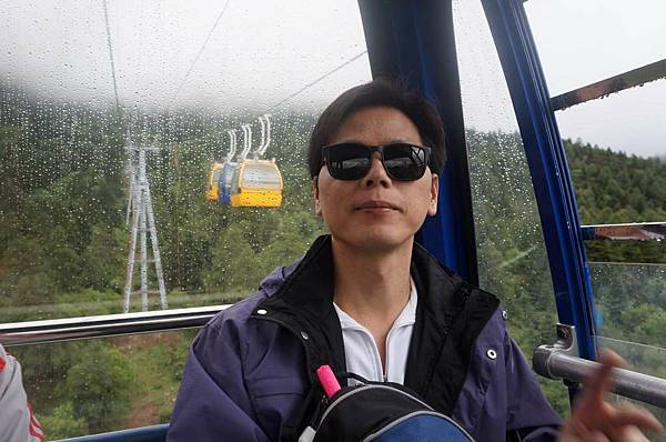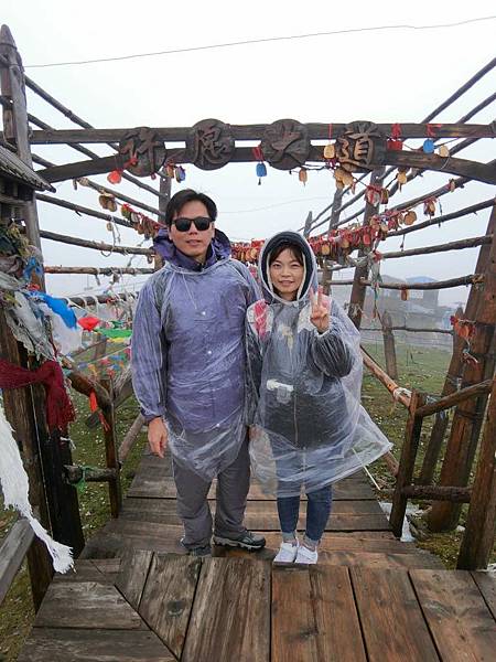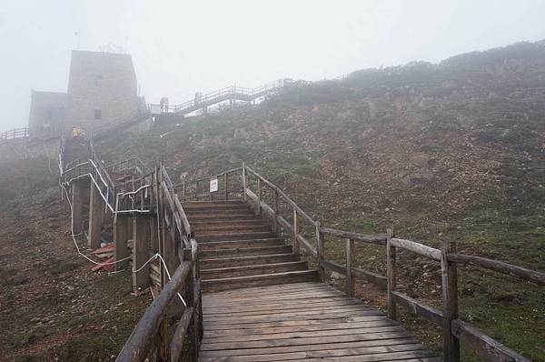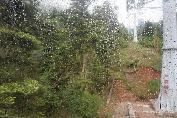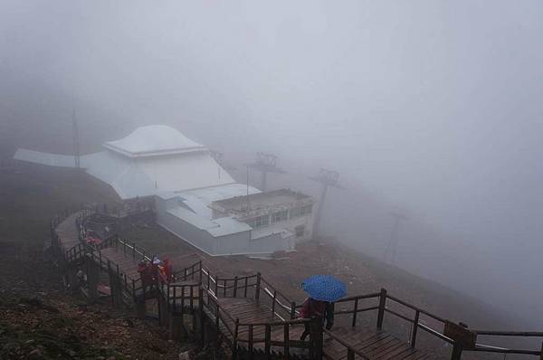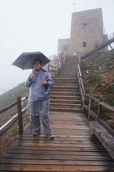 出來後,整個雲霧壟罩,還下起雨來,比爸穿起輕便雨衣並撐著傘。