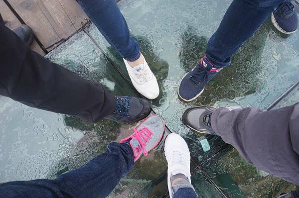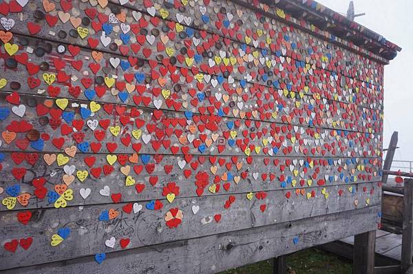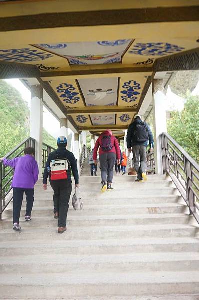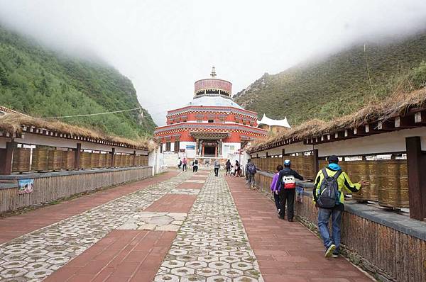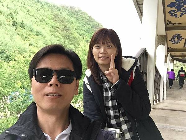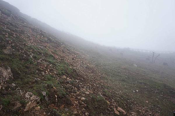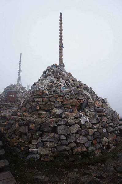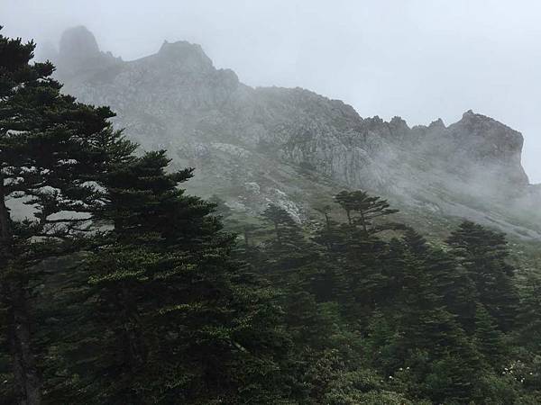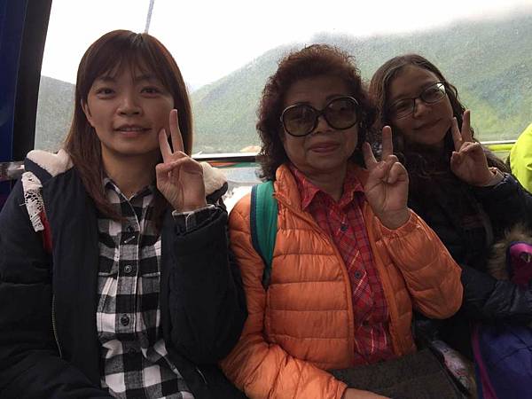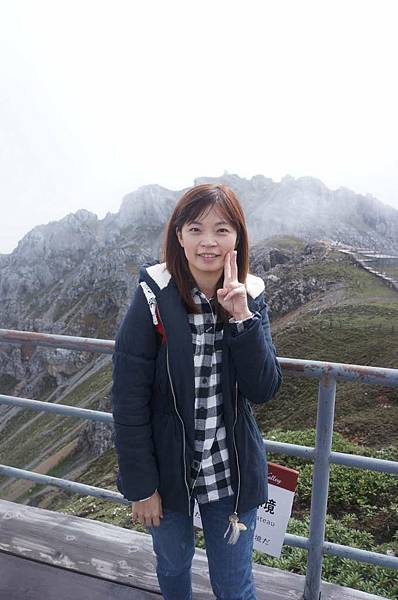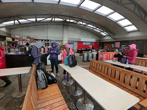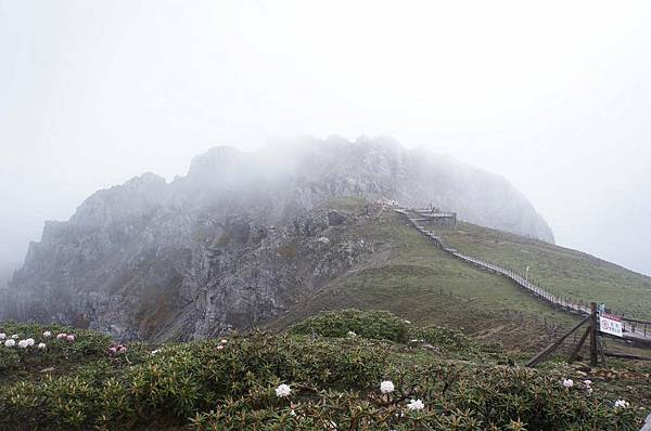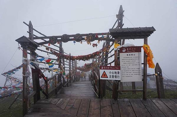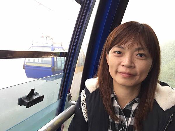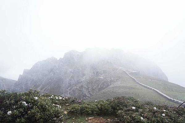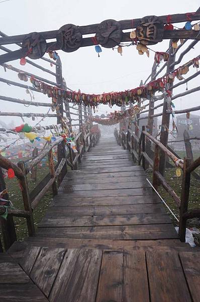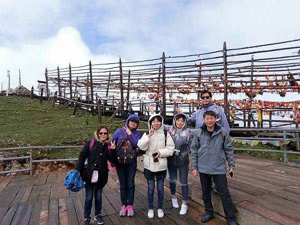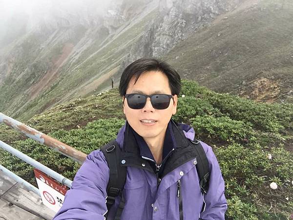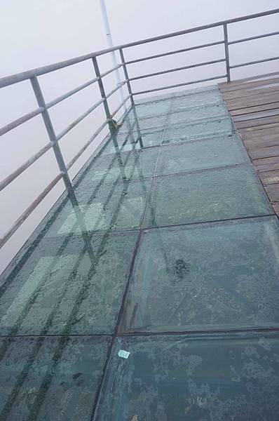 出來後,整個雲霧壟罩,還下起雨來,比爸穿起輕便雨衣並撐著傘。